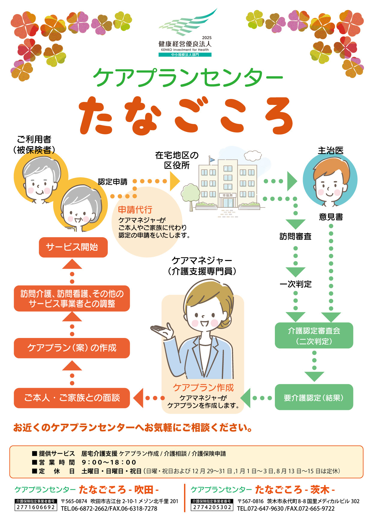 ケアプランセンターたなごころ -吹田-〒565-0874 吹田市古江台2-10-1 メゾン北千里201TEL.06-6872-2662FAX.06-6318-7278